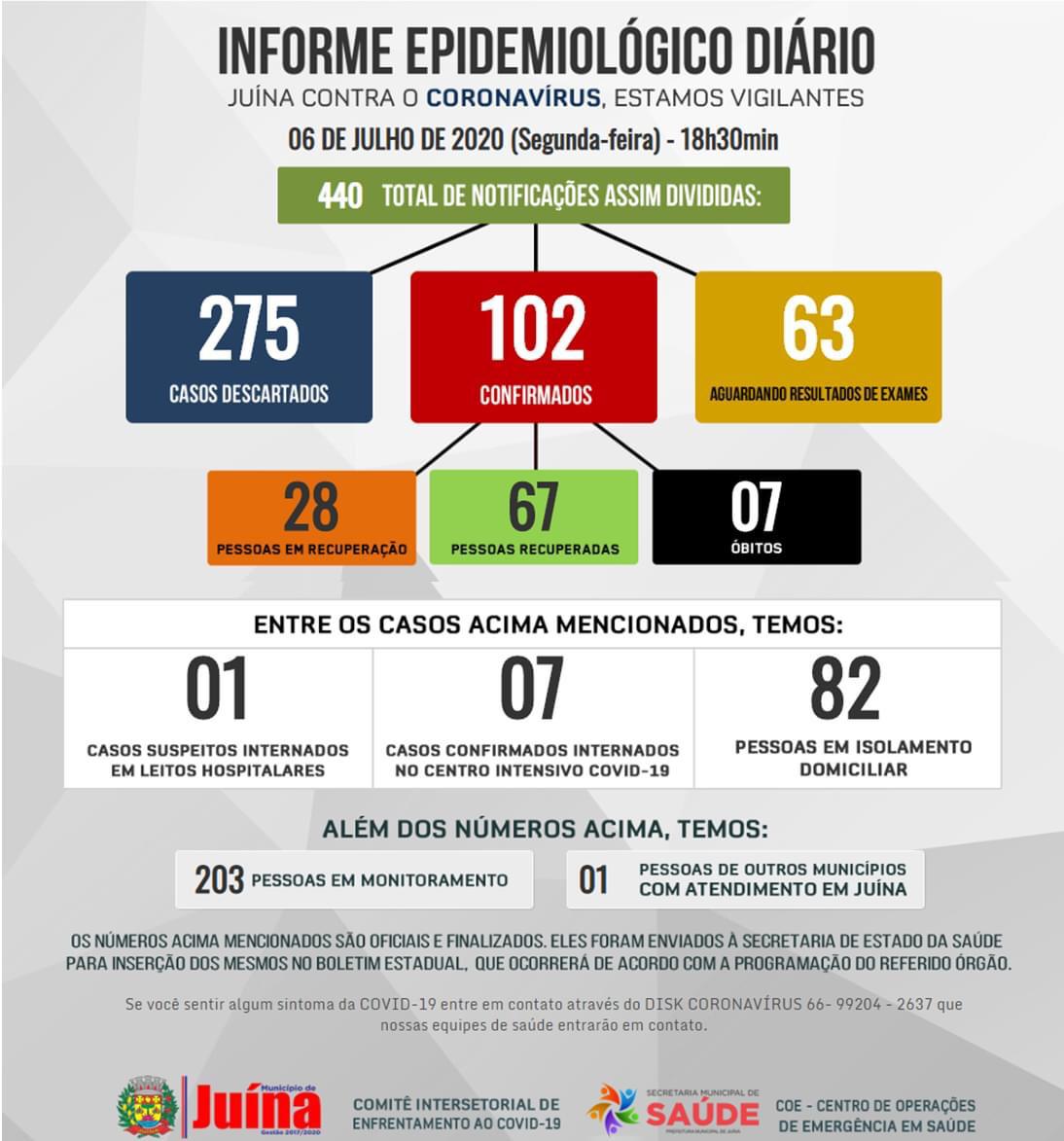 Segundo o Informe Epidemiológico Diário divulgado pela Secretaria Municipal de Saúde na segunda-feira, dia 06 de julho, no município de Juína já foram confirmados 102 casos do novo coronavírus, desses, 28 estão com a doença ativa, 67 já se recuperaram e 07 óbitos foram registrados em decorrência da doença.