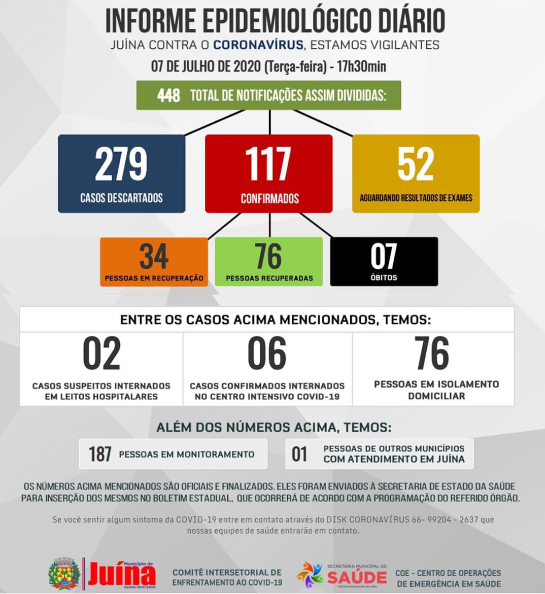 Segundo o Informe Epidemiológico Diário divulgado pela Secretaria de Saúde na terça-feira, dia 07 de julho, já foram confirmados 117 casos do novo coronavírus no município de Juína, desses, 34 pessoas estão com a doença ativa, 76 já se recuperaram e 07 óbitos foram registrados.