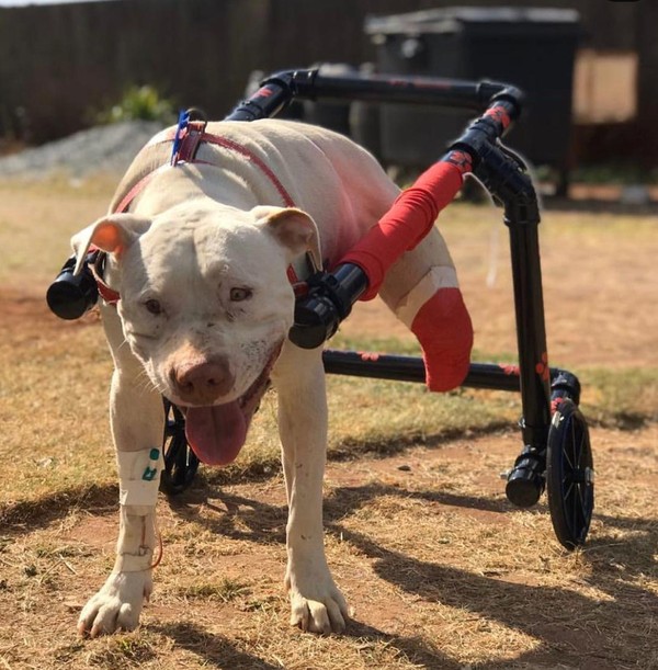 Sansão, o cão pitbull que teve as duas patas traseiras decepadas, ganhou uma cadeira de rodas, na tarde desta quinta-feira (9) em Belo Horizonte. O equipamento foi doado por uma voluntária.