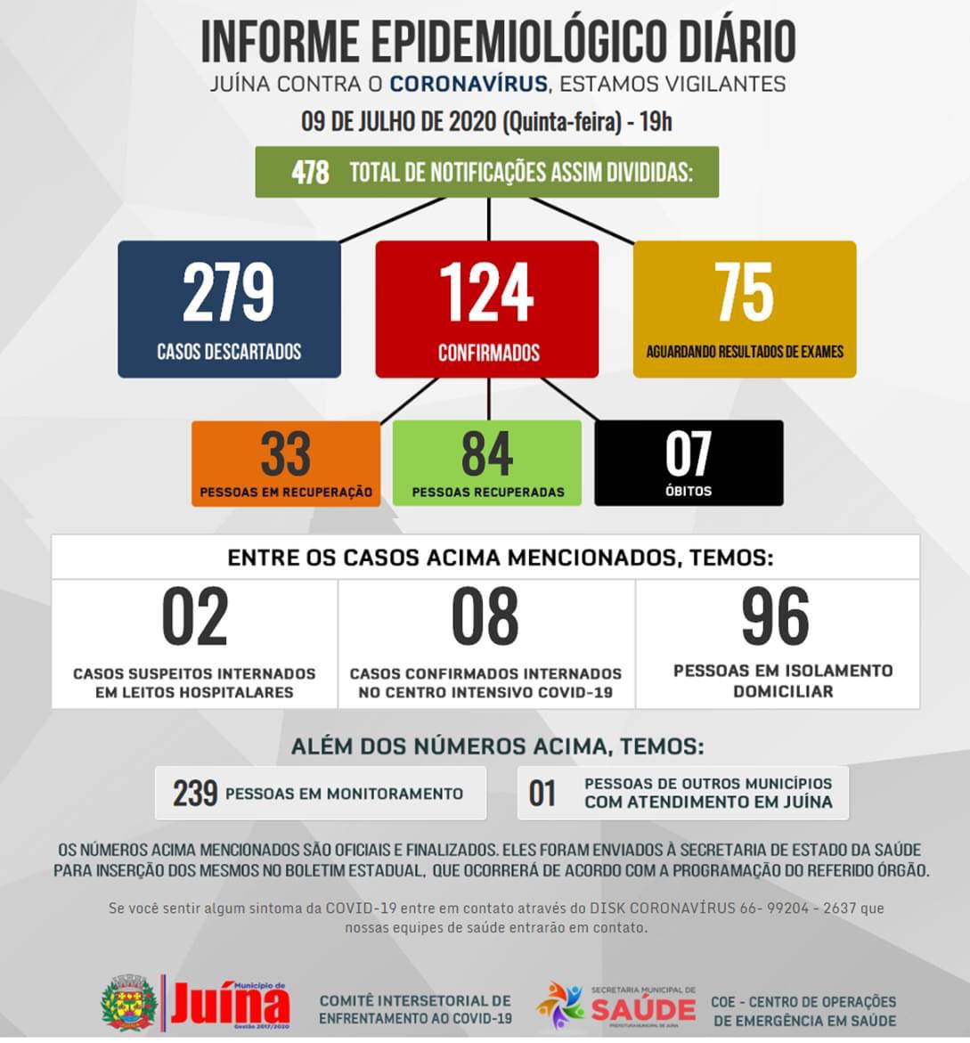 Segundo o Informe Epidemiológico Diário divulgado pela Secretaria Municipal de Saúde na quinta-feira, dia 09 de julho, já foram confirmados 124 casos do novo coronavírus no município de Juína, desses casos, apenas 33 pessoas estão com a doença ativa, 84 pessoas já se recuperaram e não tem mais a doença e 07 óbitos foram registrados.
