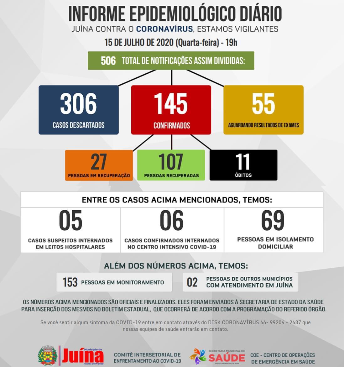 Segundo o Informe Epidemiológico Diário divulgado pela Secretaria Municipal de Saúde na quarta-feira, dia 15 de julho, já foram confirmados 145 casos do novo coronavírus em Juína, desses, 27 pessoas estão com a doença na fase ativa, 107 já se recuperaram e 11 óbitos foram registrados em decorrência da doença.