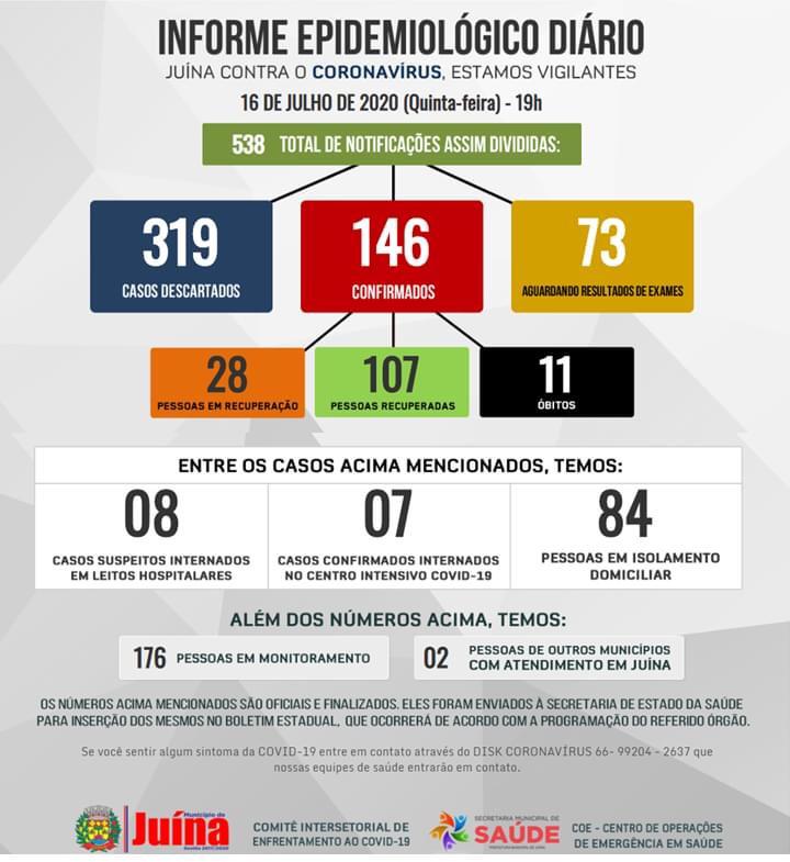 Segundo o Informe Epidemiológico Diário divulgado pela Secretaria Municipal de Saúde na quinta-feira, dia 16 de julho, já foram confirmados 146 casos do novo coronavírus em Juína, desses, 28 pessoas estão com a doença na fase ativa, 107 já se recuperaram e 11 vieram óbito em decorrência.
