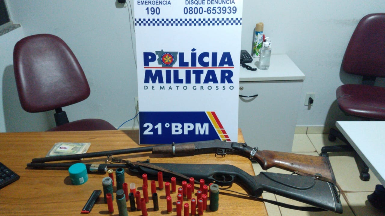 No local, em uma das residências foram encontradas e apreendidas duas espingardas e 19 munições intactas. O suspeito estava escondido em outra residência próxima, ele tentou fugir, mas foi cercado e preso pela equipe de policiais.