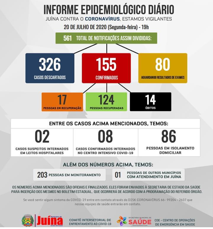 Segundo o Informe Epidemiológico Diário divulgado pela Secretaria Municipal de Saúde na segunda-feira, dia 20 de julho, já foram confirmados 155 casos do novo coronavírus em Juína, desses, apenas 17 pessoas estão com a doença na fase ativa, 124 pessoas já se recuperaram e aumentou para 14 o número de óbitos em decorrência da doença.