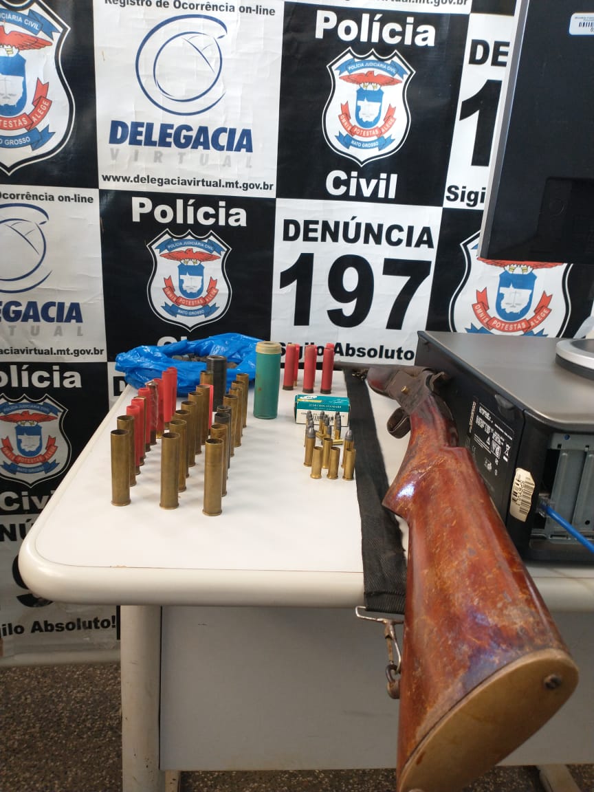 Na hora da apreensão o suspeito não estava no local, porém a Polícia Civil conseguiu localizar na residência de sua namorada, ele foi preso em flagrante com arma de fogo também a munições recarregadas.