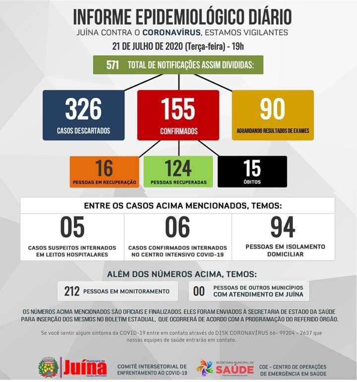 Segundo o Informe Epidemiológico Diário divulgado pela Secretaria Municipal de Saúde na terça-feira, dia 21 de julho, já foram confirmados 155 casos do novo coronavírus em Juína, desses, 16 estão com a doença na fase ativa, 124 se recuperaram e aumentou para 15 o número de óbitos.