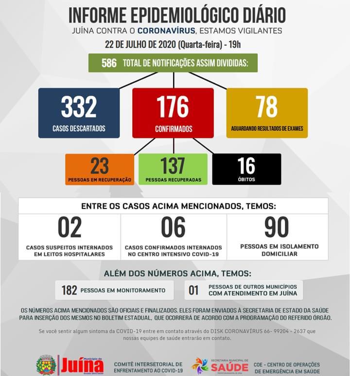 Segundo o Informe Epidemiológico Diário divulgado pela Secretaria Municipal de Saúde na quarta-feira, dia 22 de julho, já foram confirmados 176 casos do novo coronavírus em Juína, desses, 23 pessoas estão com a doença na fase ativa, 137 pessoas já se recuperaram e aumentou para 16 o número de óbitos em decorrência da doença.