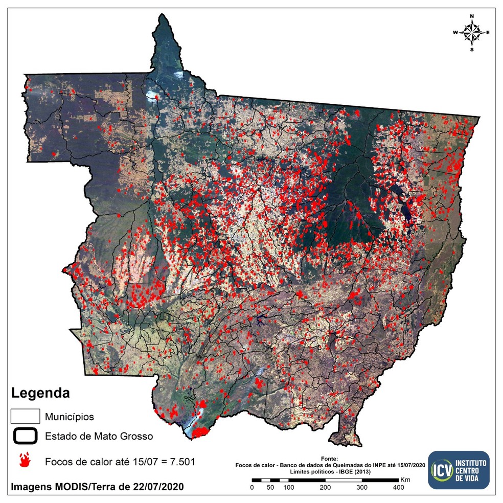 Os dados foram obtidos a partir de uma ferramenta interativa lançada nesta quinta-feira (23) pelo Instituto Centro de Vida (ICV) para o monitoramento dos focos de calor no estado durante o período de proibição de queimadas.