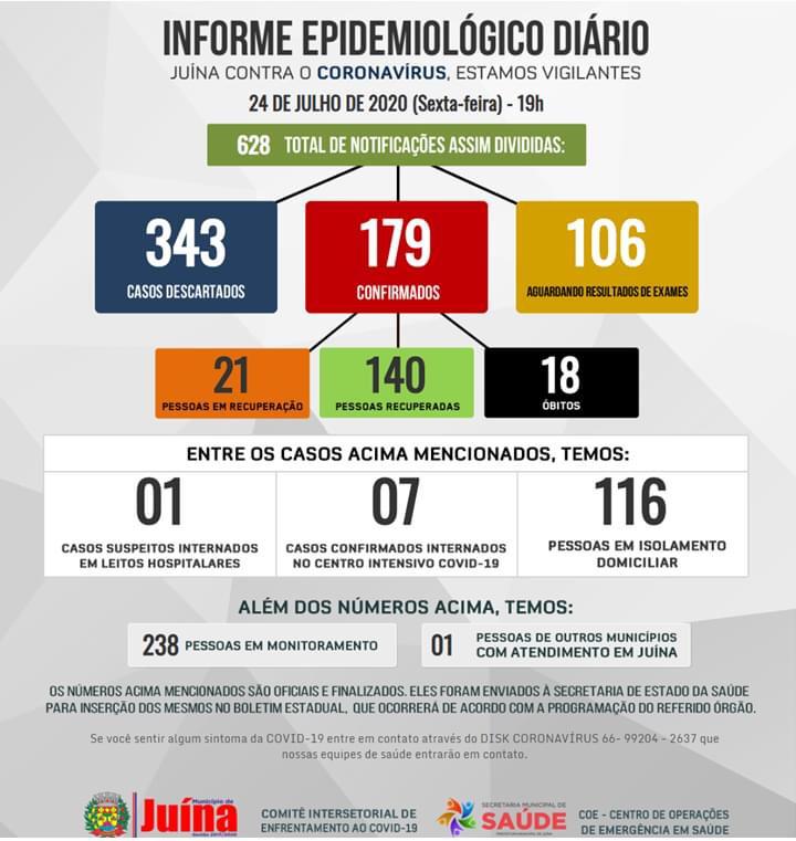 Segundo o Informe Epidemiológico Diário divulgado pela Secretaria Municipal de Saúde na sexta-feira, dia 24 de julho, já foram confirmados 179 casos do novo coronavírus em Juína, desses, 21 pessoas estão com a doença na fase ativa, 140 já se recuperaram e 18 óbitos foram registrados.