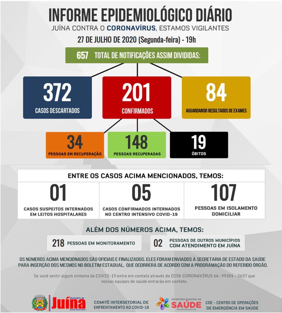No Informe Epidemiológico Diário de segunda-feira, dia 27 de julho, foi constatado que já foram confirmados 201 casos confirmados do novo coronavírus em Juína, desses, 34 pessoas estão com a doença na fase ativa, 148 já se recuperaram e 19 pessoas vieram a óbito em decorrência da doença.