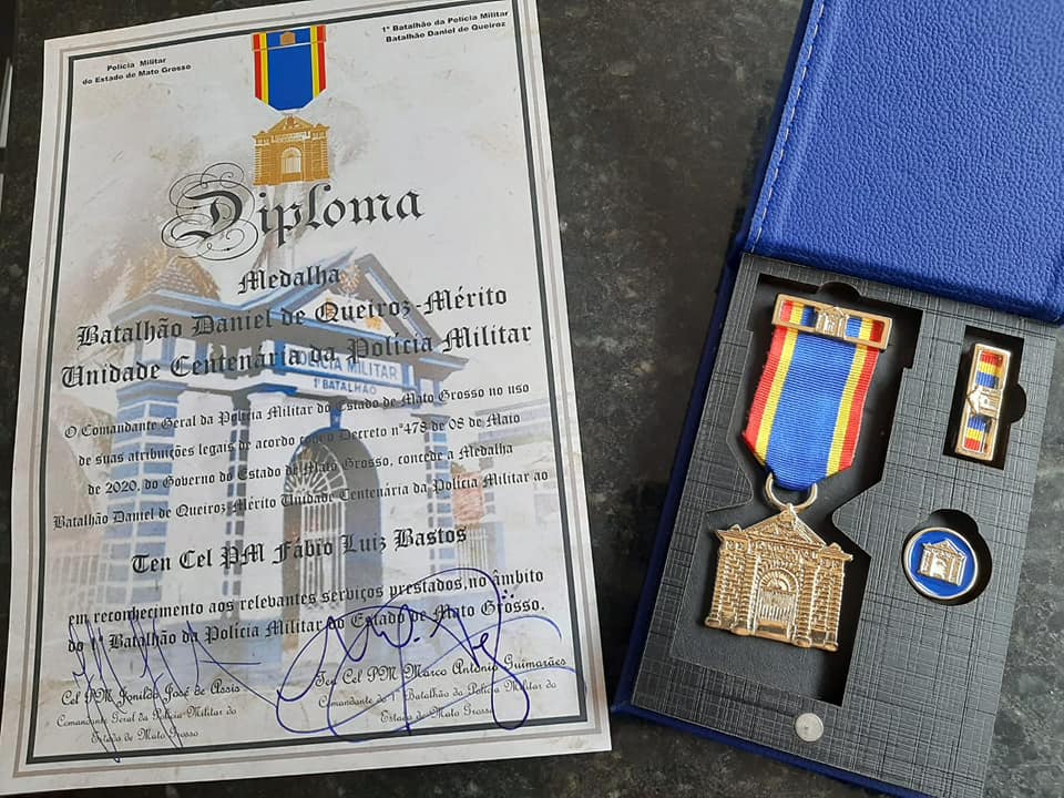 O Tenente Coronel PM Fábio Luiz Bastos, Comandante do 8º Comando Regional com sede em Juína, recebeu nesta sexta-feira (21.08) a "Medalha Batalhão Daniel de Queiroz – Mérito Unidade Centenária", honraria esta conferida a personalidades civis e militares que contribuíram com a história da unidade.