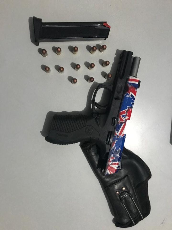 Durante a busca no interior do veículo foi localizado uma arma de fogo tipo pistola no calibre. 380, embaixo do banco de passageiro, também estavam junto com a arma um carregador com 13 munições. Os policiais constataram que apesar da arma ser registrada, o suspeito não possuía autorização de porte de arma. Diante dos fatos, o armamento juntamente com o suspeito foi encaminhando à Delegacia de Polícia Civil, onde foi confeccionado o Boletim de Ocorrência e entregue para as demais providências.