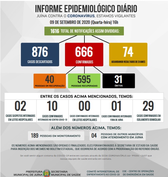 No município de Juína já foram confirmados 666 casos do novo coronavírus, desses, 595 pessoas se recuperaram, 40 estão com a doença na fase ativa e 31 vieram a óbito.