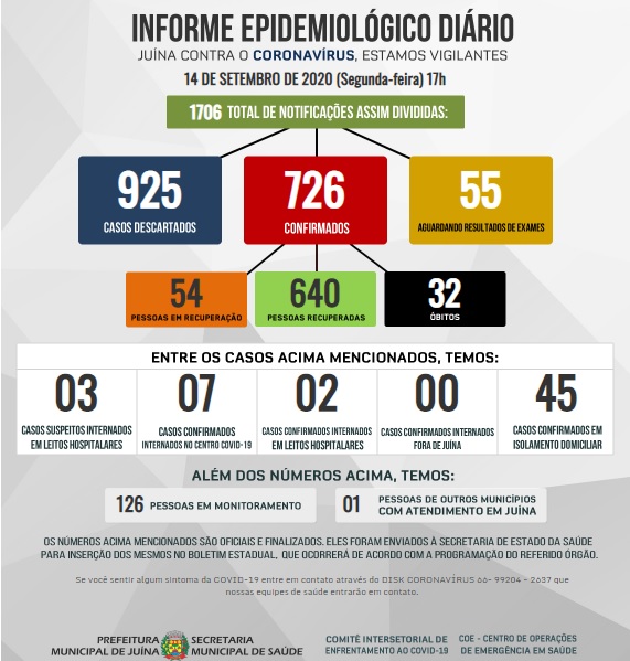 No município de Juína já foram confirmados 726 casos do novo coronavírus, desses, 640 pessoas se recuperaram, 54 estão com a doença na fase ativa e 32 vieram a óbito.