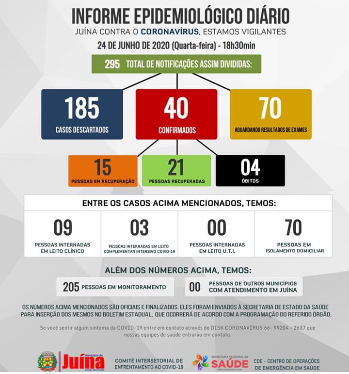 Segundo o Informe Epidemiológico Diária, divulgado pela Prefeitura Municipal na noite de quarta-feira, dia 24, no município de Juína já foram confirmados 40 casos do novo coronavírus, desses, 15 estão sendo monitorados, 21 se recuperaram e 4 pessoas morreram em decorrência da doença. Além disso, 70 pessoas estão aguardando os resultados dos exames confirmatórios.