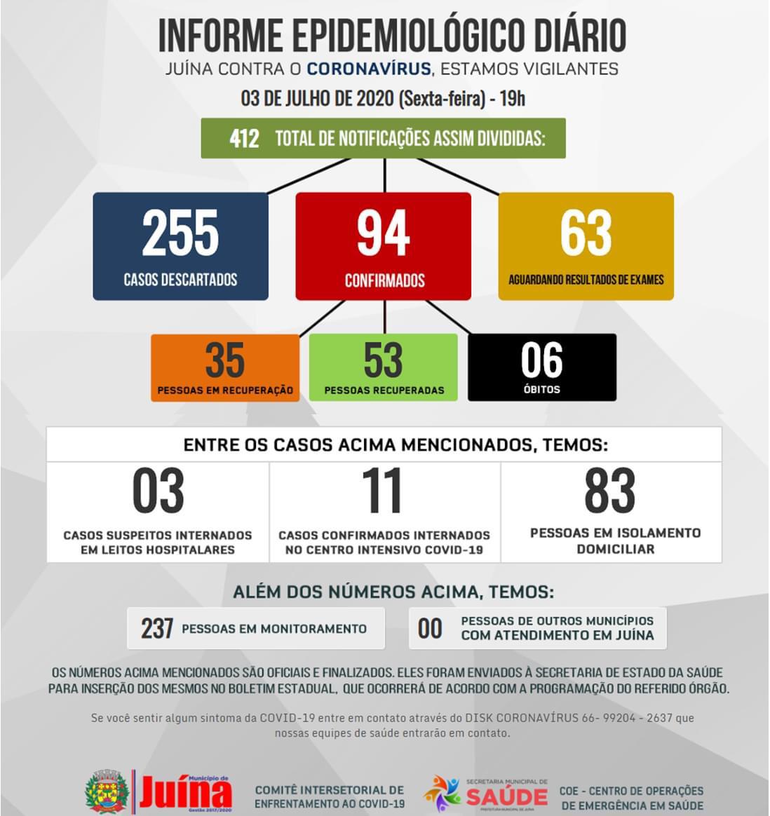 Segundo o Informe Epidemiológico Diário, divulgado pela Secretaria Municipal de Saúde na sexta-feira, dia 03 de julho, no município de Juína já foram confirmados 94 casos do novo coronavírus, desses, 35 estão ativos, 53 se recuperaram e 06 pessoas vieram a óbito.