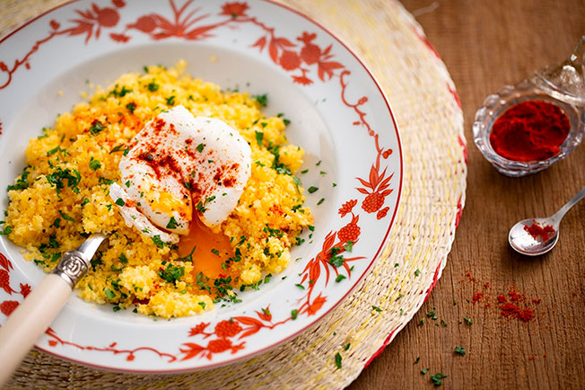 Regue a água com manteiga sobre o cuscuz e misture com o garfo – a água com manteiga deixa o cuscuz mais úmido e saboroso. Sirva a seguir com os ovos pochê temperados com sal, pimenta e páprica defumada, polvilhados com salsinha.