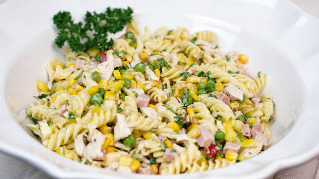Cozinhe o macarrão e reserve. Corte a salsinha, a cebolinha, o milho, a ervilha e deixe secar. Corte o presunto, a muçarela e a linguiça. Frite a linguiça. Depois de tudo pronto, misture todos os ingredientes no macarrão. Acrescente a maionese e uma pitada de sal. Sirva em seguida.