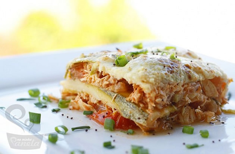 - Montagem: unte a assadeira com azeite. Coloque uma camada de abobrinha (seque-as de leve depois de tirar da água com sal), os tomates picados, o queijo parmesão ralado e uma camada do frango. Repita quantas vezes for necessário e termine com uma camada de abobrinha.