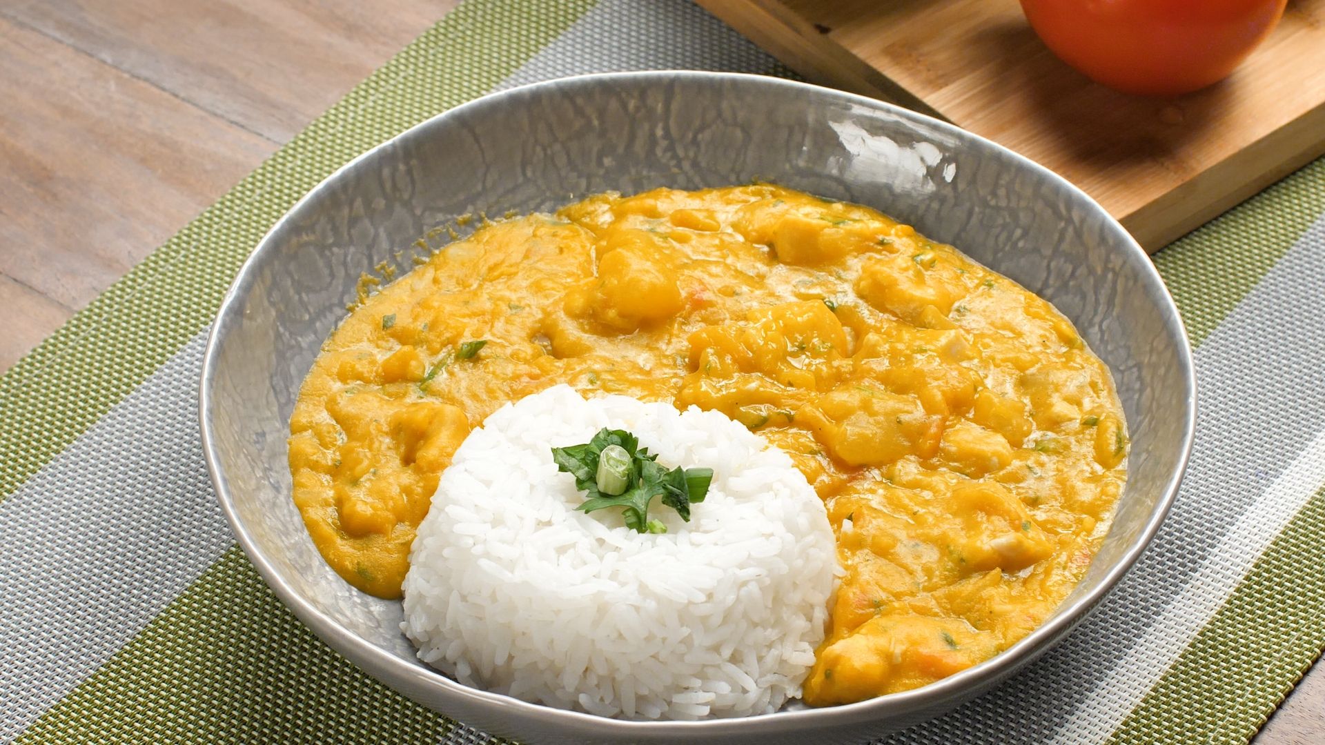 Junte ao refogado, acrescente o leite de coco, aumente o fogo e mexa bem.