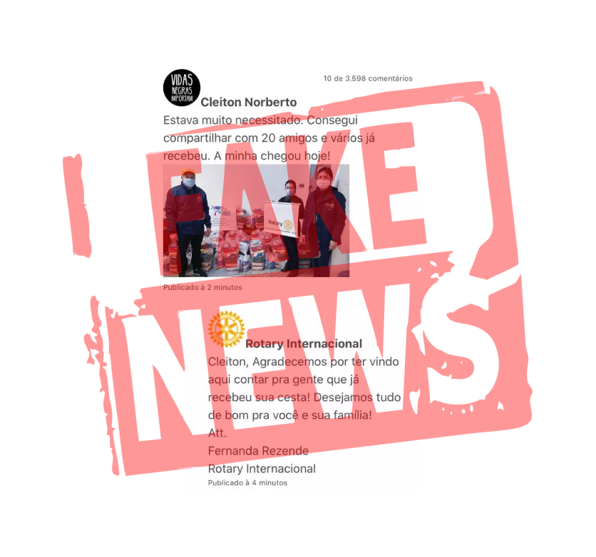 Em comunicado na página do Facebook, a instituição diz: "O Rotary International comunica que não está distribuindo cestas básicas através do preenchimento de dados cadastrais. Esta informação se trata de uma fake news."